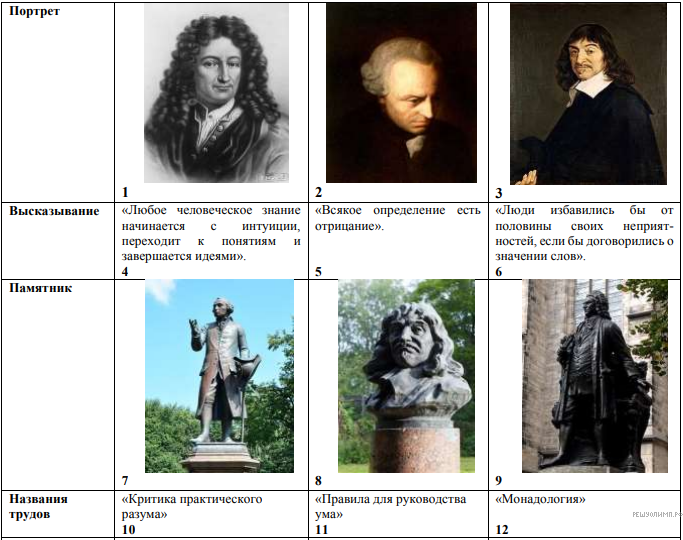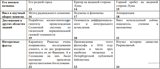 Версия для печати и копирования в MS WordВ таблице представлена информация о философах. Она распределена по ячейкам произвольно. Только об одном из выдающихся мыслителей правильная информация дана по всем восьми основаниям. Изучите материал, определите философа. Выпишите его фамилию и все восемь цифр, под которыми расположена информация о нём.